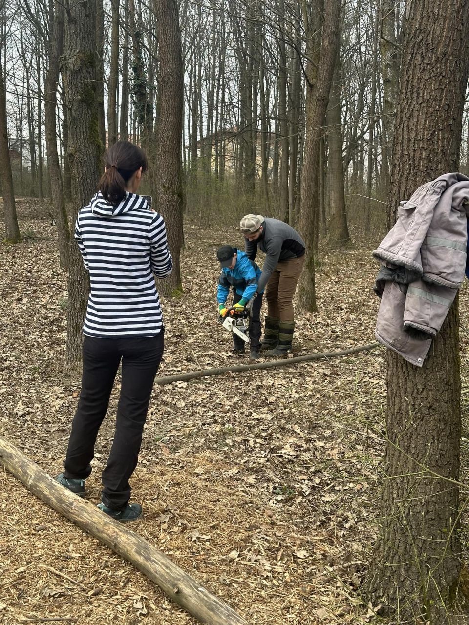 Pílenie kalamitného dreva, zber odpadu, dosypanie a rozhrabanie mulčovacej kôry a lúpanie dreva.