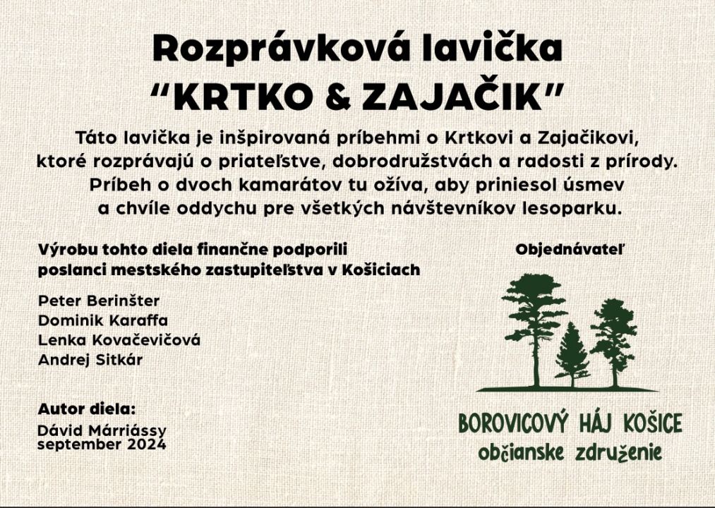 V Borovicovom háji pribudla nová rozprávková lavička od umeleckého rezbára Dávida Márriássyho. Lavička vznikla aj vďaka finančnej podpore poslancov Mestského zastupiteľstva v Košiciach.
