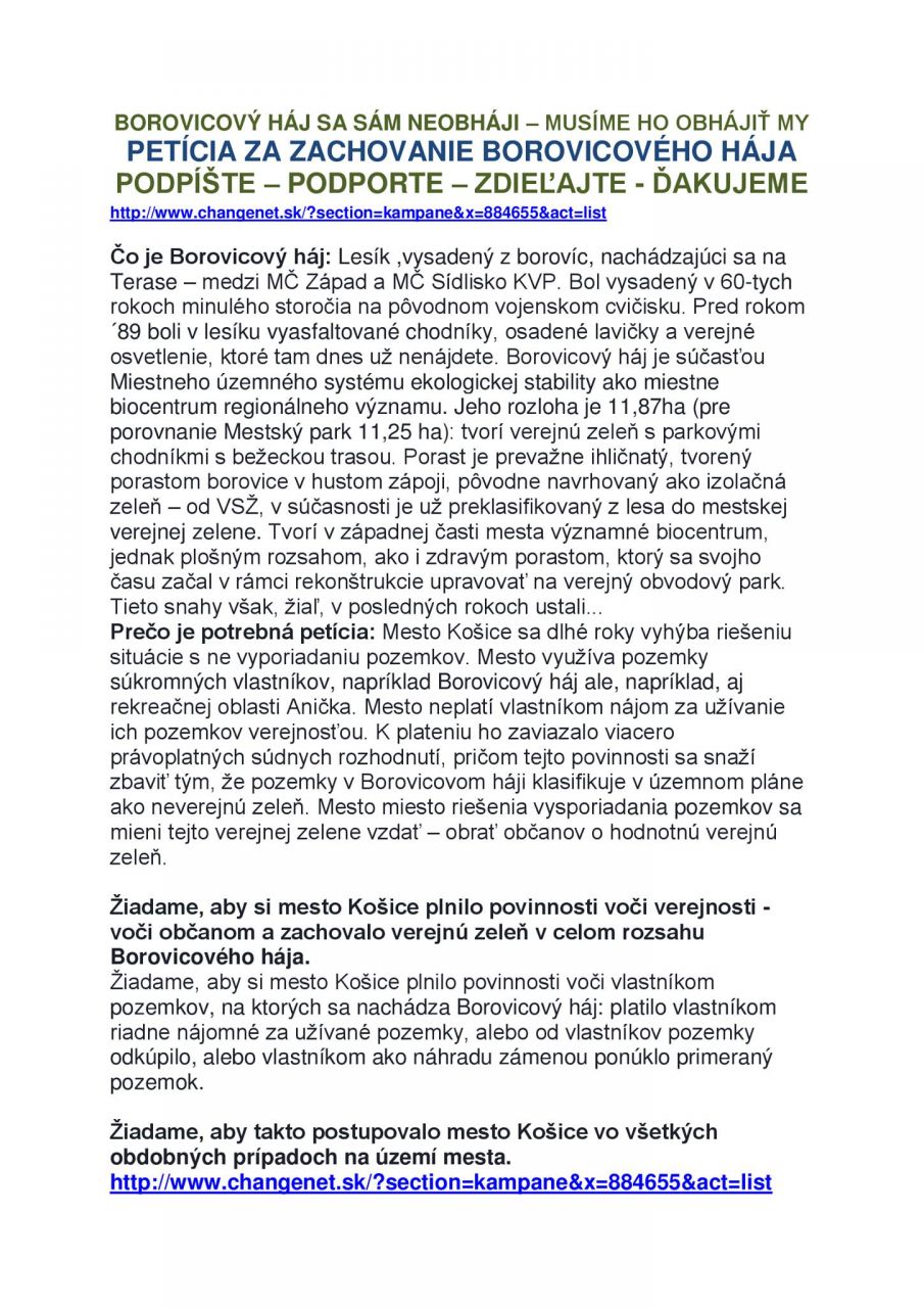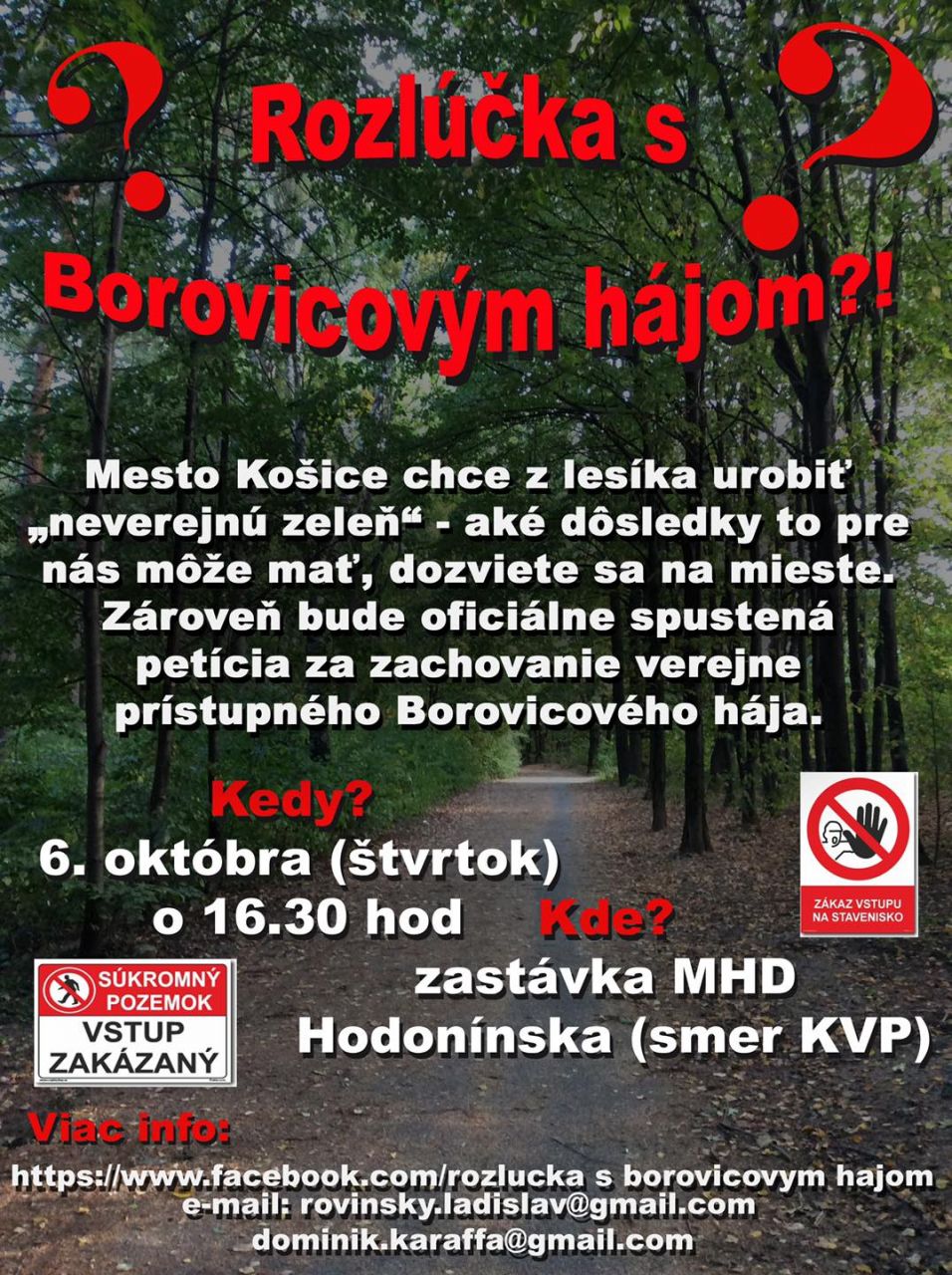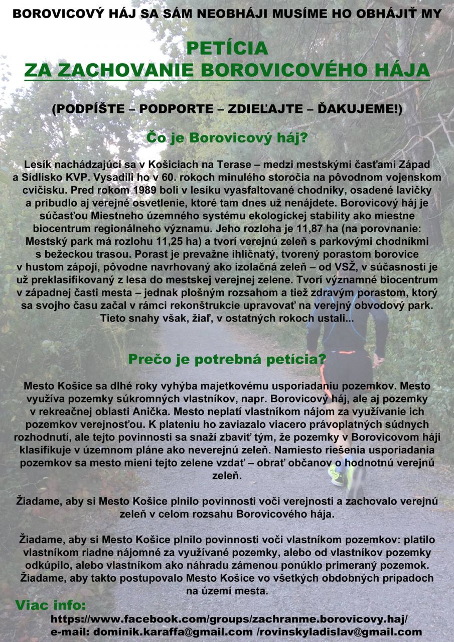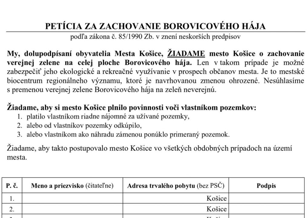 Žiaľ, hrozí mu zánik v dôsledku plánovanej výstavby, ktorá by nenávratne zmenila jeho charakter a význam pre komunitu. Cieľom tejto petície je zachovať Borovicový háj ako verejný priestor pre nás a pre ďalšie generácie. Podporte prosím našu snahu o jeho záchranu podpisom petície: Petícia na ChangeNet.(http://www.changenet.sk/?section=kampane&x=884655)